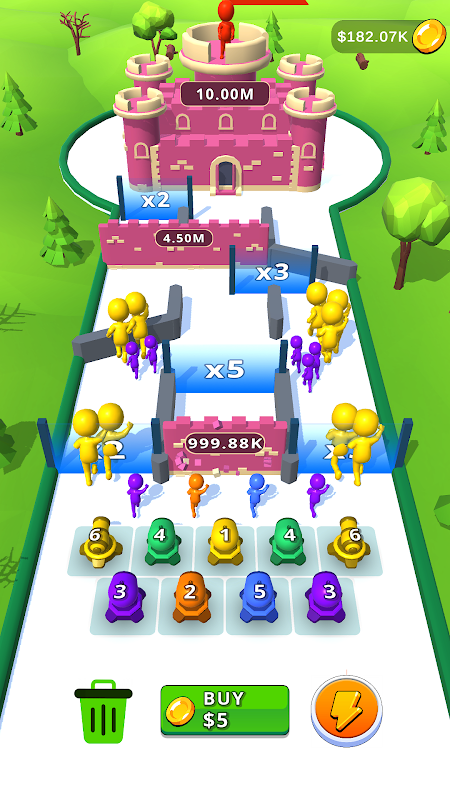 「アイドルアタック3D」へようこそ。この中毒性の高いモバイルゲームでは、大砲からキャラクターを撃ちます。コインを獲得し、それを使って大砲を購入しましょう。大砲を合体させて強度を上げましょう。画面を素早くタップすると、大砲の発射速度が上がります。防御陣地を破壊し、ついには城を破壊しましょう。