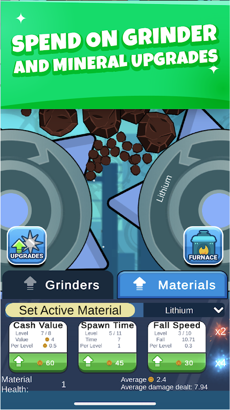 炉で粉砕した素材を使ってグラインダーのパワーをアンロックしましょう。グラインダーは、最も柔らかい素材からダイヤモンドまでアップグレードできます。最初は弱い素材でも、この段階的に強くなるゲームで、どんどん強くなっていきます!粉砕シミュレーターの大物になりましょう!