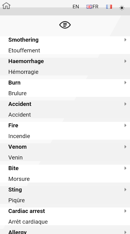 - Situations. Listes des conseils à suivre dans différents cas de situations critiques (brûlure, étouffement, hémorragie, accident, incendie, venin, morsure, piqûre, arrêt cardiaque, allergie, fracture, entorse, épilepsie, empoisonnement, perte de conscience).