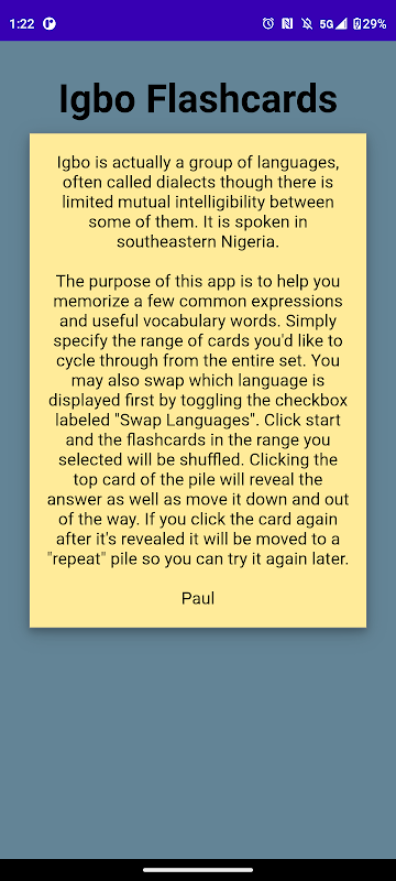 このアプリの目的は、イボ語のよく使われる表現や役立つ語彙をいくつか覚えることです。アプリを使うには、セット全体から切り替えたいカードの範囲を指定するだけです。また、「言語を入れ替える」チェックボックスをオンにすることで、最初に表示される言語を入れ替えることもできます。「開始」をクリックすると、選択した範囲のフラッシュカードがシャッフルされます。山札の一番上のカードをクリックすると、答えが表示され、下に移動して邪魔になりません。表示されたカードをもう一度クリックすると、「繰り返し」山札に移動され、後でもう一度試すことができます。