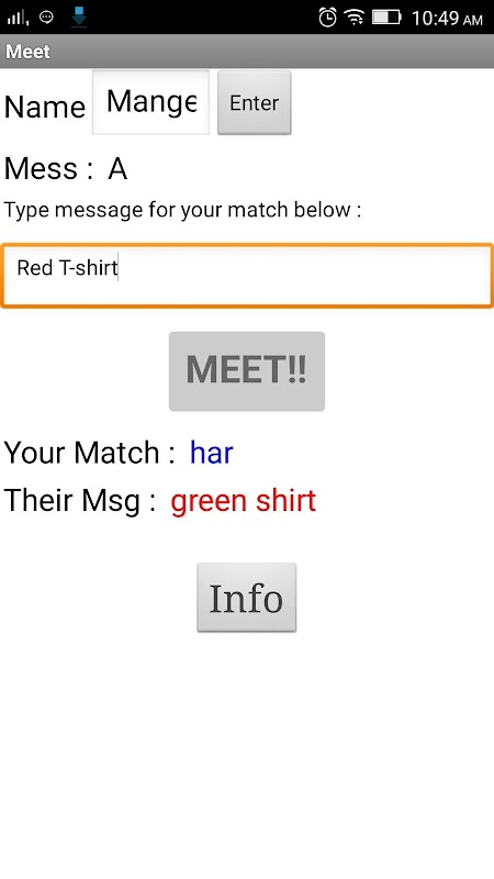 会う機能が用意されました。ミート機能を使用すると、お食事の際に知的会社のためのあなたの混乱のランダムな人を満たすことができます。 1)前の画面であなたの混乱を選択してください。 2)名前を記入し、Enterキーを押します。 3)メッセージ、タイプの食事では、シャツの色を押しミートなどの識別を与えます! 4)あなたの試合を待ちます!あなたは2時間で複数回試みることができません。あなたが再会を押してみましょうするには、2時間後に10秒を待ちます。あなたは今のところ予定をキャンセルすることはできません。あなたが待っている間にアプリを最小限に抑えることができますが、閉じないでください。他の人は5分のウィンドウに電源が入らない場合は、お食事を進めます。あなたのアイデンティティは、アプリで完全に秘密にされています。