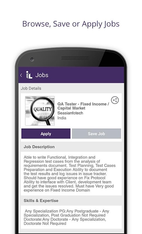 • Search jobs/ Skilled People in an unique way using your areas of expertise/Skillset. Just keep adding all your skillsets in your iLook profile and you will start getting displayed directly with all of the recruiters/individuals respectively.