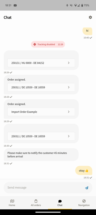 - ストップごとに注文ステータスを更新: 各ストップのステータス (積み込み開始、積み込み完了、給油、休憩、待機など) を更新します。証拠として GPS 位置追跡を使用して待ち時間を文書化します。