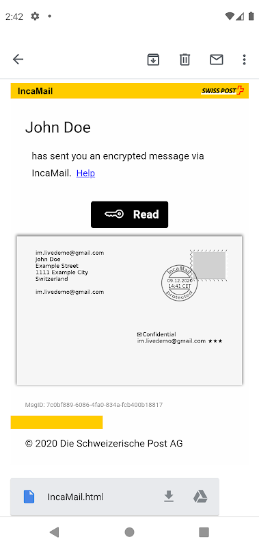 最新のスマートフォンでは、IncaMailメッセージはメールクライアント(Gmailアプリなど)で直接開かれます。これは、「読み取り」ボタン(使用可能な場合)を使用するか、IncaMail.html添付ファイルを開くことによって実行されます。