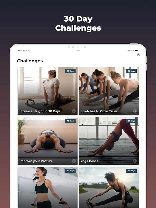 このアプリは、身長を伸ばすのに非常に有益なストレッチ体操をご案内します。また、姿勢も改善します。厳密に従うことをお勧めする、身長を伸ばすためのストレッチエクササイズのリストをご覧ください.