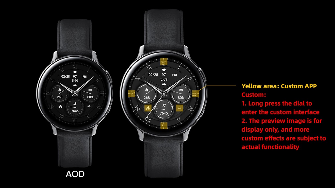 ダイヤルは Wear OS 1 での実行をサポートします。外側の円: カスタム APP 2。上部: 日付、心拍数、週、距離 3。中央: カロリーとパーセンテージインジケーター、バッテリーレベルとパーセンテージインジケーター 4。下部:カスタムアプリ、歩数、歩数目標パーセンテージポインターカスタマイズ:複数のカスタマイズ領域を選択可能互換性のあるデバイス:Pixel Watch、Galaxy Watch 4/5/6/7 以上、およびその他のデバイス