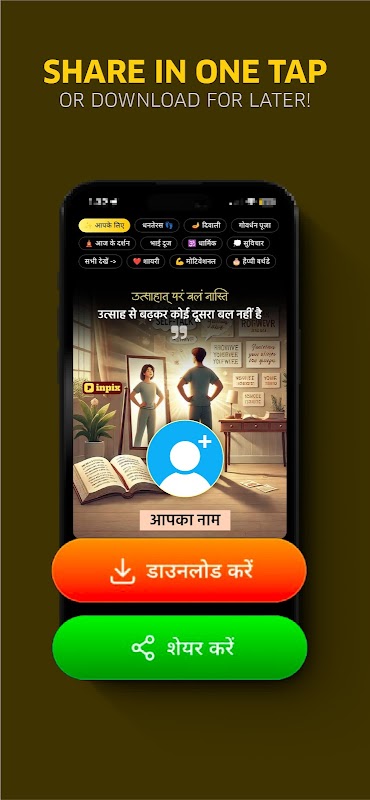 人生、祭り、インド文化、ヒンドゥー教の神々、著名人、偉大な哲学者、作家に関する名言を、お名前と写真付きのパーソナライズされたステータスメッセージとしてご利用いただけます。写真だけでなく、あらゆる種類のビデオステータスコンテンツもInPixで独占的に入手できます。他の写真編集アプリで画像に引用文を追加する必要はなく、タップして共有するだけです。