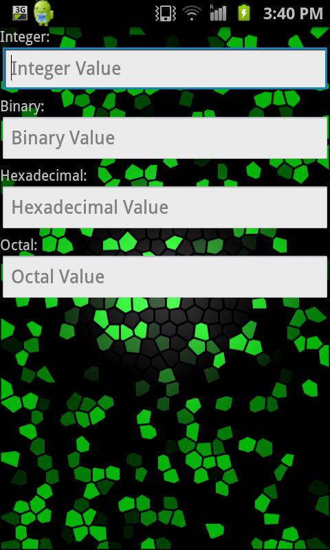 Int2Bin offers a simple yet powerful method of converting integer values to their corresponding decimal, hexadecimal, and octal values. There is no button to press, the calculations are performed as you type!