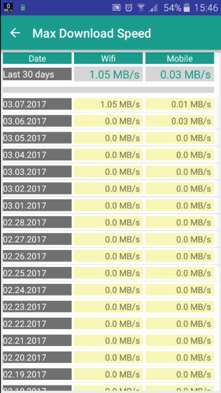 インターネットスピードメーターは、ステータスバーにと通知でリアルタイムのインターネットの速度を示しています。それも、過去30日間のデータのダウンロード量と過去30日間の間に到達する最大ダウンロードおよびアップロードの速度を示しています。