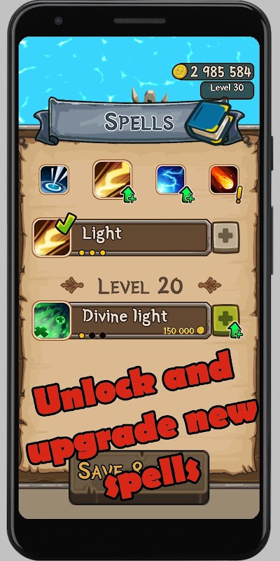 Use your destructive spells by swiping up and down from left to right with one or more fingers. Manage your spells, improve them, use them at the right time and eliminate the invaders before they manage to reach the king and destroy all hope!