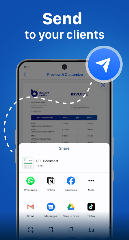 見積書から請求書を簡単に作成し、プロフェッショナルなPDF形式でクライアントと共有できます。この請求書作成ツールを使えば、請求書や見積書をメールやメッセージアプリで送信したり、印刷して直接渡すこともできます。