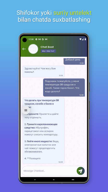 ウシュブ・イロヴァ・オルカリ・シフォコルニ・タンラッシュ・ヴァ・オジンジズガ・クレイ・ヴァクトゥダ・ティビー・マスラハット・オリシュガ・イムコン・ベラディ。 Shifokor maslahatini Tanlaganingizdan so‘ng belgilangan vaqtda shifokorni o‘zi siz bilan video aloqaga chiqadi. Shifokor yoki sun'iy intellekt bilan chat orqali ham suhbatlashing. Tekshiruv xulosalarini ham shifokorga tibby maslahatdan avval chat orqali yuboring 。