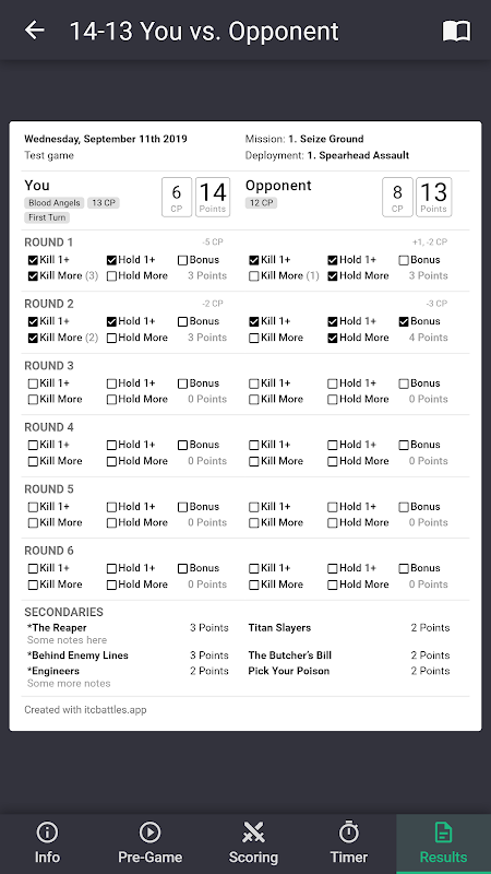 ITC Battlesは、Warhammer 40k ITC競技用ゲームのスコアキーピングとルールリファレンスを簡単に提供します*。アプリからトーナメントラウンドの結果をBCPに送信することもできます!