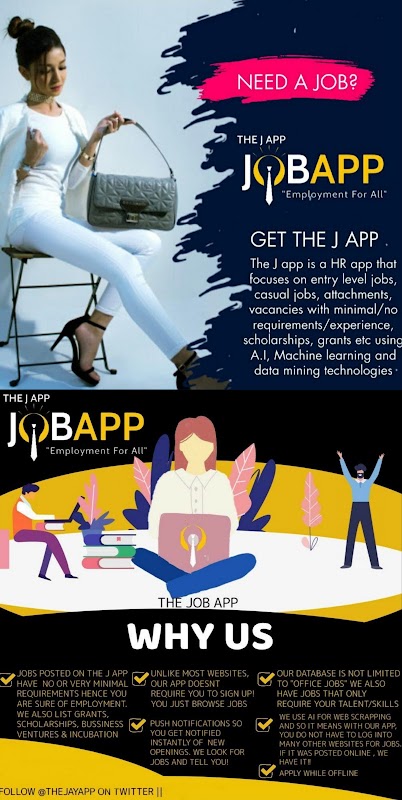 J app is a HR app focusing on entry level jobs, attachments, vacancies with no/minimum requirements/history needed, casual jobs, temporary jobs, manual jobs, scholarships, grants etc. The app uses A.I, Machine learning and data mining to get the listings before the infomation is verified and made public on the App