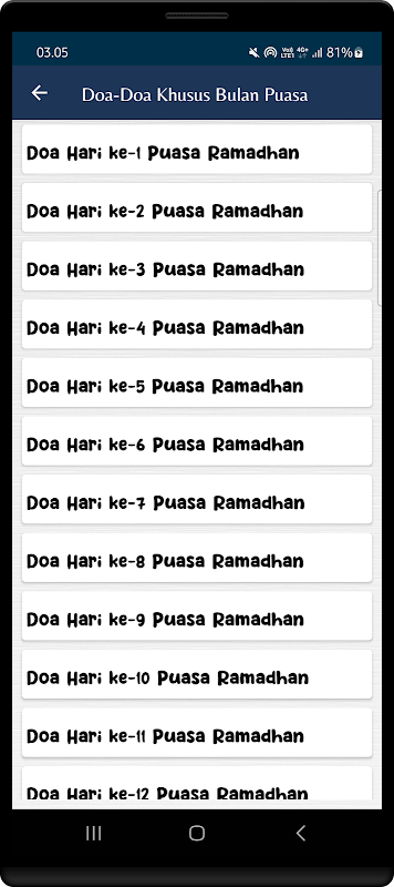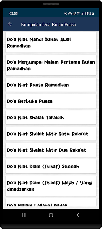 このアプリケーションには、ラマダンの初めに沐浴と割礼を受ける意図を求める祈り、ラマダン月の最初の夜の祈り、ラマダンに断食する意図を求める祈り、断食を解くための祈り、その意図を求める祈りが含まれています。タラウィを祈ること、ウィティルの祈りの 1 ラカートを祈る意図を求める祈り、2 ラカートの意図を求める祈り ウィトルの祈り、沈黙する意図を求める祈り (I'tikaf) Sunnah、沈黙の意図(I'tikaf) 義務/必須、ライラトゥル・カダルの夜の祈りと特別な祈り ラマダン断食月の断食初日から30日目まで、およびドーア・クヌトとラマダンのスケジュール14時44分 30日。宇宙の創造者であるアッラーへの信仰と献身を深めて、この祝福された断食月ラマダンを迎えましょう。