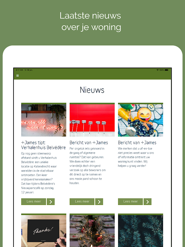 +James の建物に住んでいますか?その後、+James の公式アプリを使用できます。アプリでは、タイムラインで他の居住者とメッセージを共有したり、+James に直接連絡したりできます。このアプリでは、住宅とその周辺地域に関する最新ニュースを読んだり、+James のサービスを利用したり、住宅に関する最新のマニュアルを見つけることができます。