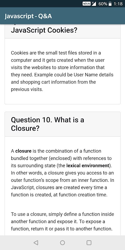 This app provides you JavaScript tricky questions, last minute preparations and rapid fire questions which helps you train your brain better and clear the interview or exam with flying colors.