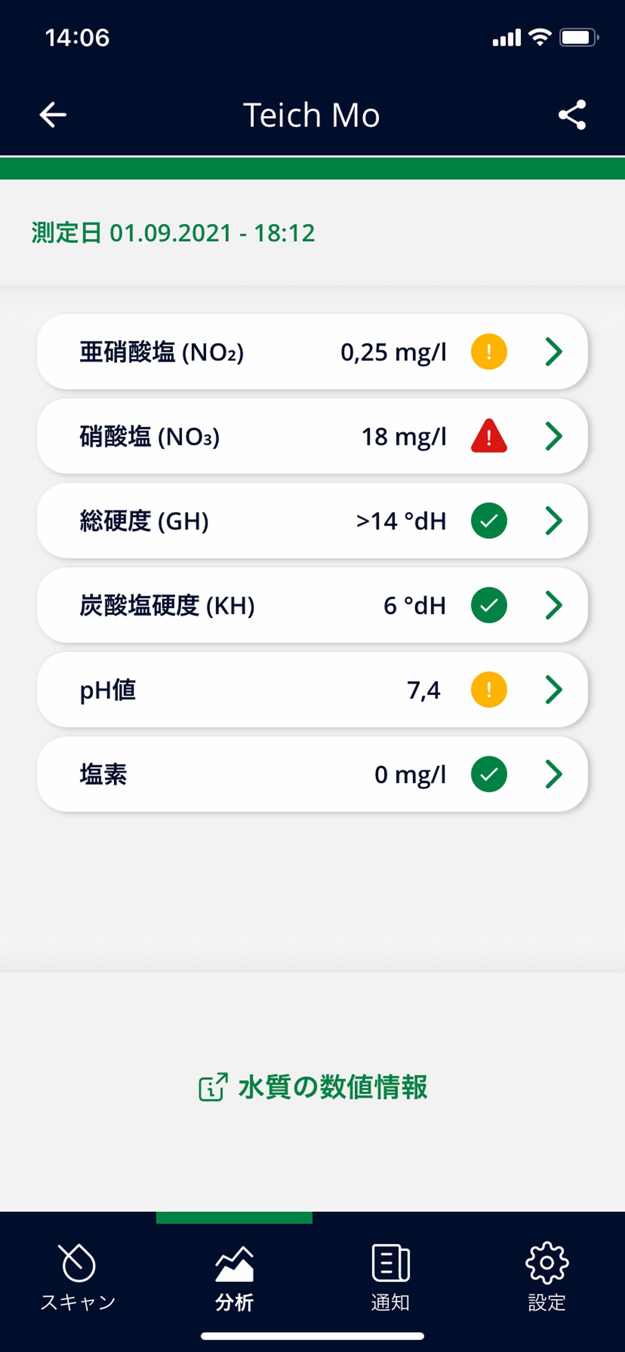 - スマホで、水槽・池・水に最も重要な水質検査値を並列分析