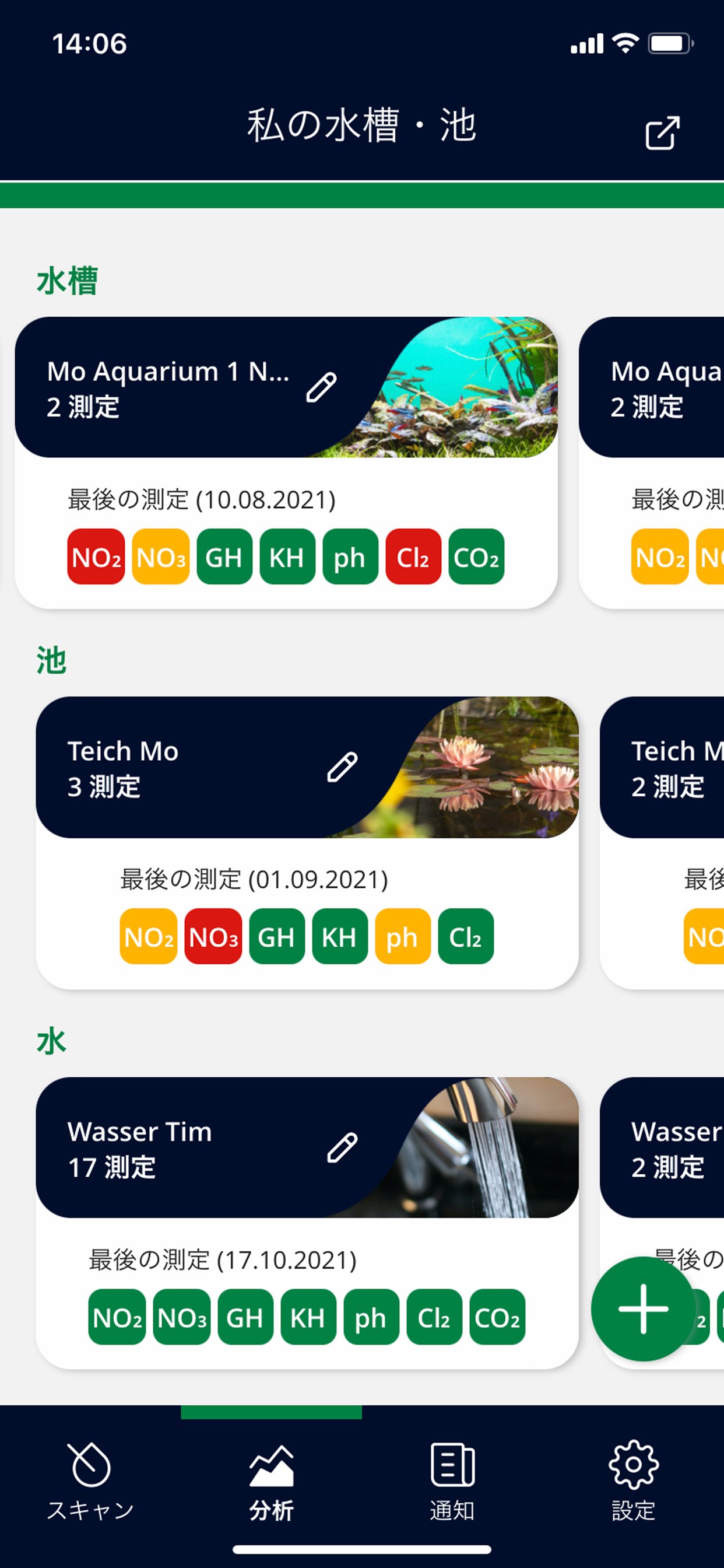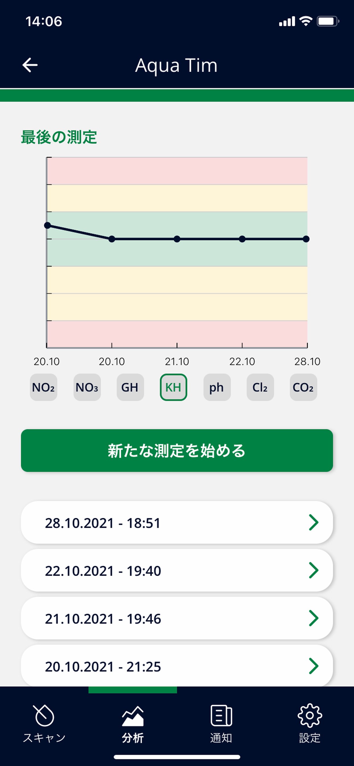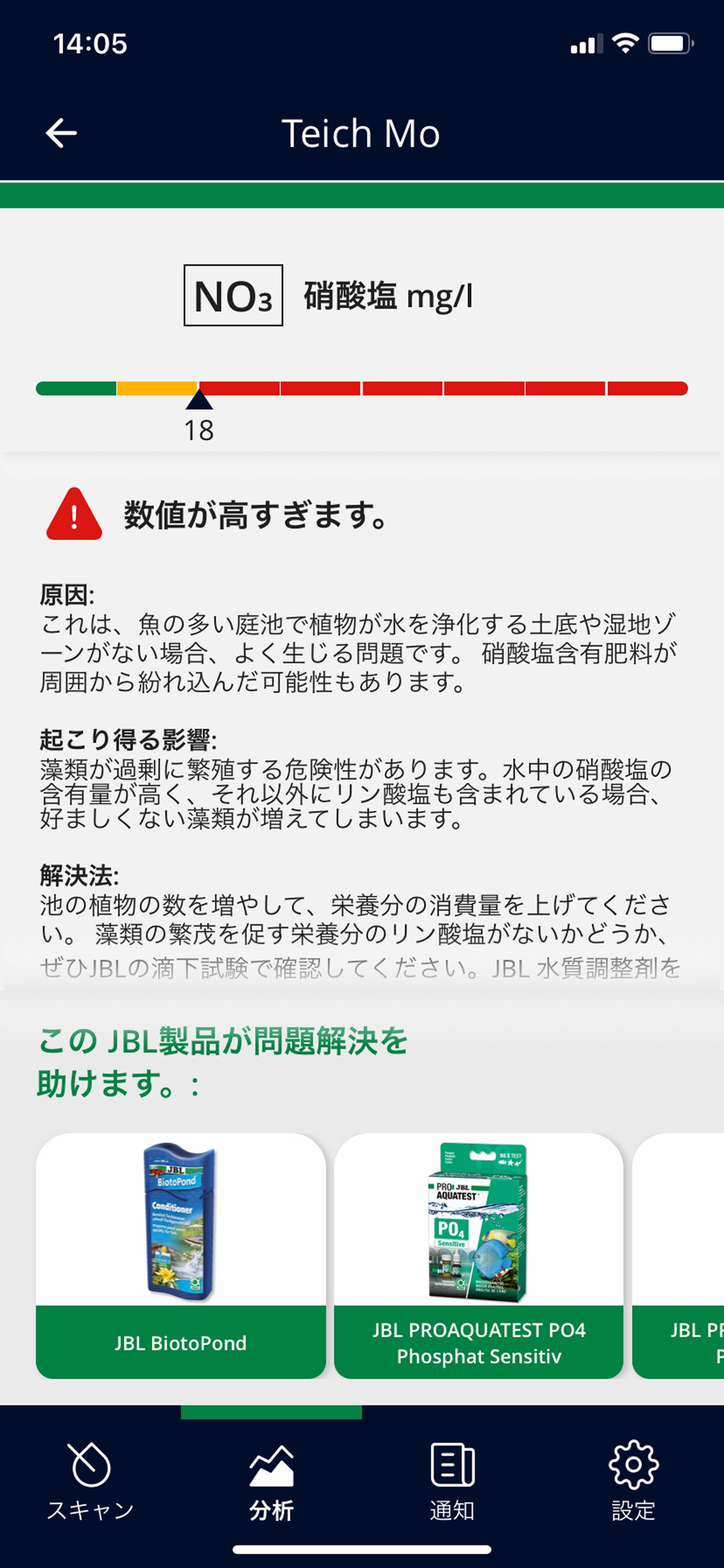 アプリを起動して、革新的技術による迅速かつ正確な分析をご体験ください。これは水槽の水質分析としては、今日までJBLのみが持つ革新的技術です。アプリの指示に従って、スキャンセットの中にある特別に調整したJBL PROSCAN ColorCardをご使用ください。「分析」では、水槽や池を管理したり、測定値をグラフで比較することができます。myJBLプロファイルを使えば、世界中どこからでもデータにアクセスできます。スマホがお手元になくても大丈夫。myJBLプロファイルを使用しない場合、最後の測定値はアプリ内にローカル保存されます。この場合も、測定と対処策の提案も含めた評価は制限なくご利用いただけます。本アプリでは、「水槽」、「池」、「水」の中から水の種類が選べます。水槽と水を選択すると、アプリで測定したpHとKHの値から、現在のCO2含有量が計算されるという特典があります。測定値や水の種類に応じて、具体的な対処方法や、どのJBL製品を使えば水の理想値/最適値を再設定できるかなどの情報が得られます。水質値では、アプリは結果一覧のみを表示し、ヒントや対処策の提案はありません。myJBLプロファイルを使えば、リマインダーやヒント、グラフによる分析評価など、さまざまな機能が利用できます。