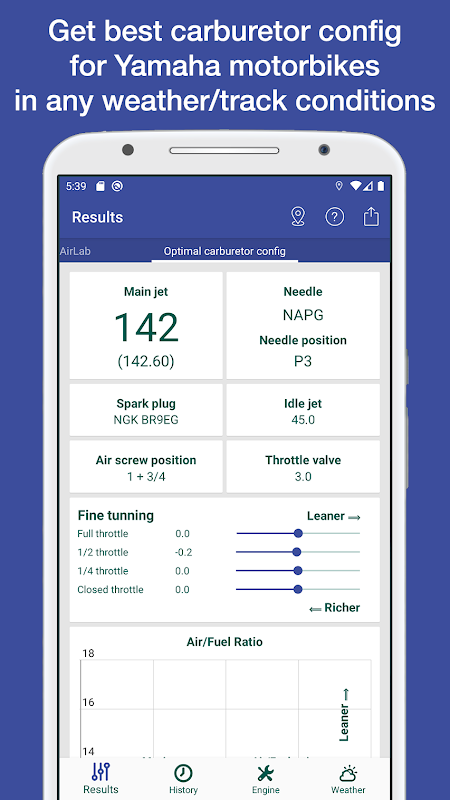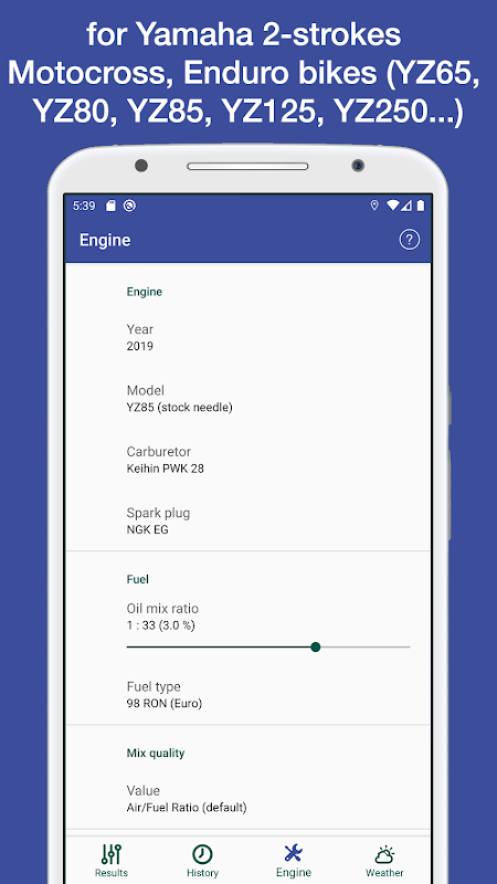 This app provides, using temperature, altitude, humidity, atmospheric pressure and your engine configuration and fuel type, a recommendation about best jetting (carburetor configuration) and spark plug to use for Yamaha 2-strokes MX bikes (YZ and PW models).