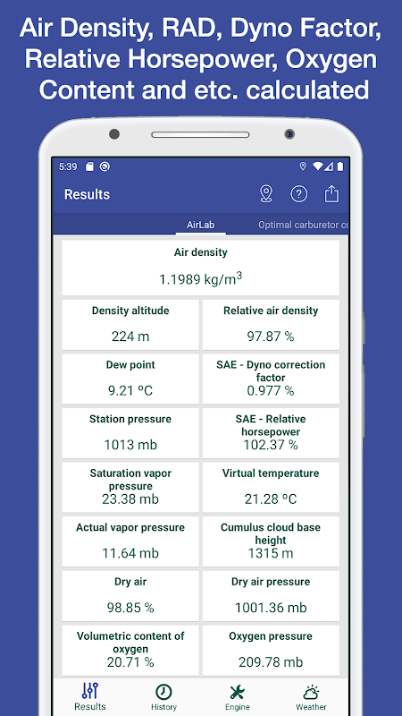 This app can obtain automatically the position and altitude to get the temperature, pressure and humidity from the nearest weather station thought internet. Internal barometer is used on supported devices for better precision. If more accuracy is needed, a portable weather station can also be used. Application can run without GPS, WiFi and internet, in this case user has to give the weather data manually.