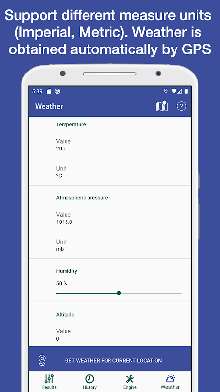 このアプリは、インターネットを考えて最寄りの気象ステーションから温度、気圧、湿度を取得するために自動的に位置と高度を取得することができます。サポートされているデバイスでは、精度を高めるために内部気圧計が使用されています。より高い精度が必要な場合は、携帯型気象観測所も使用できます。アプリケーションはGPS、WiFi、インターネットなしで実行できます。この場合、ユーザーは天気データを手動で入力する必要があります。