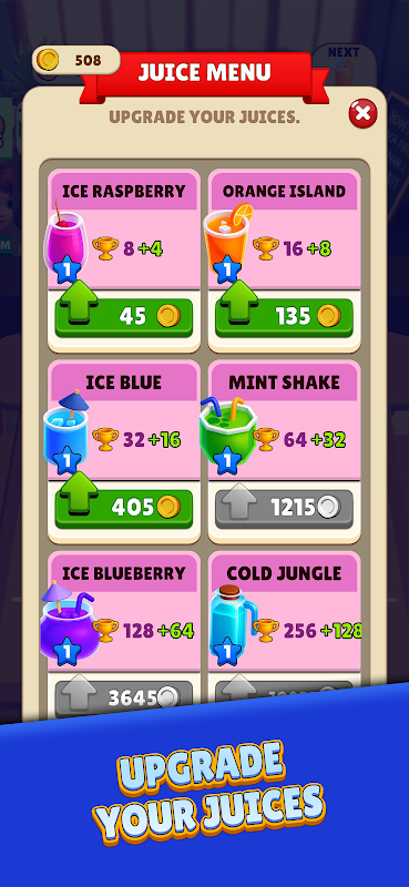 ジュースを強化して、より速く、より高いスコアを獲得できるアップグレードシステム。