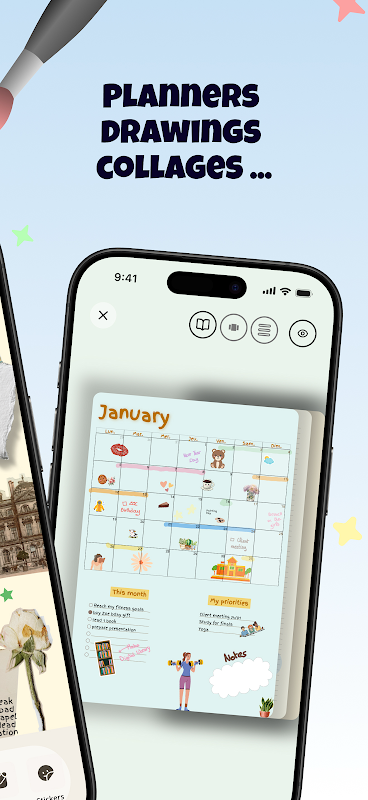 クリエイティブな日記アプリ - 絵を描いたり、コラージュを作ったり、12,000種類以上のステッカーでデコレーションしたりできます。