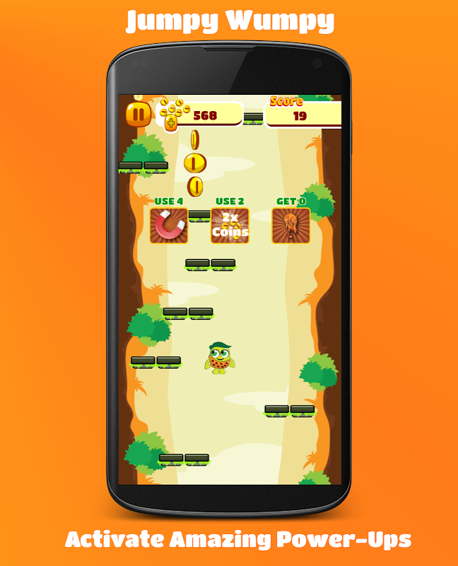 Jump Wumpy Jump! Your goal is to take your Jumpy Wumpy as high as you can. Avoid or destroy the evil plants and birds. Get amazing power ups. Grab shield to protect yourself. Grab turbo power up to fly up twice the speed. Collects coins and use them to get and upgrade boosts. Watch out for the moving and breakable platforms.
