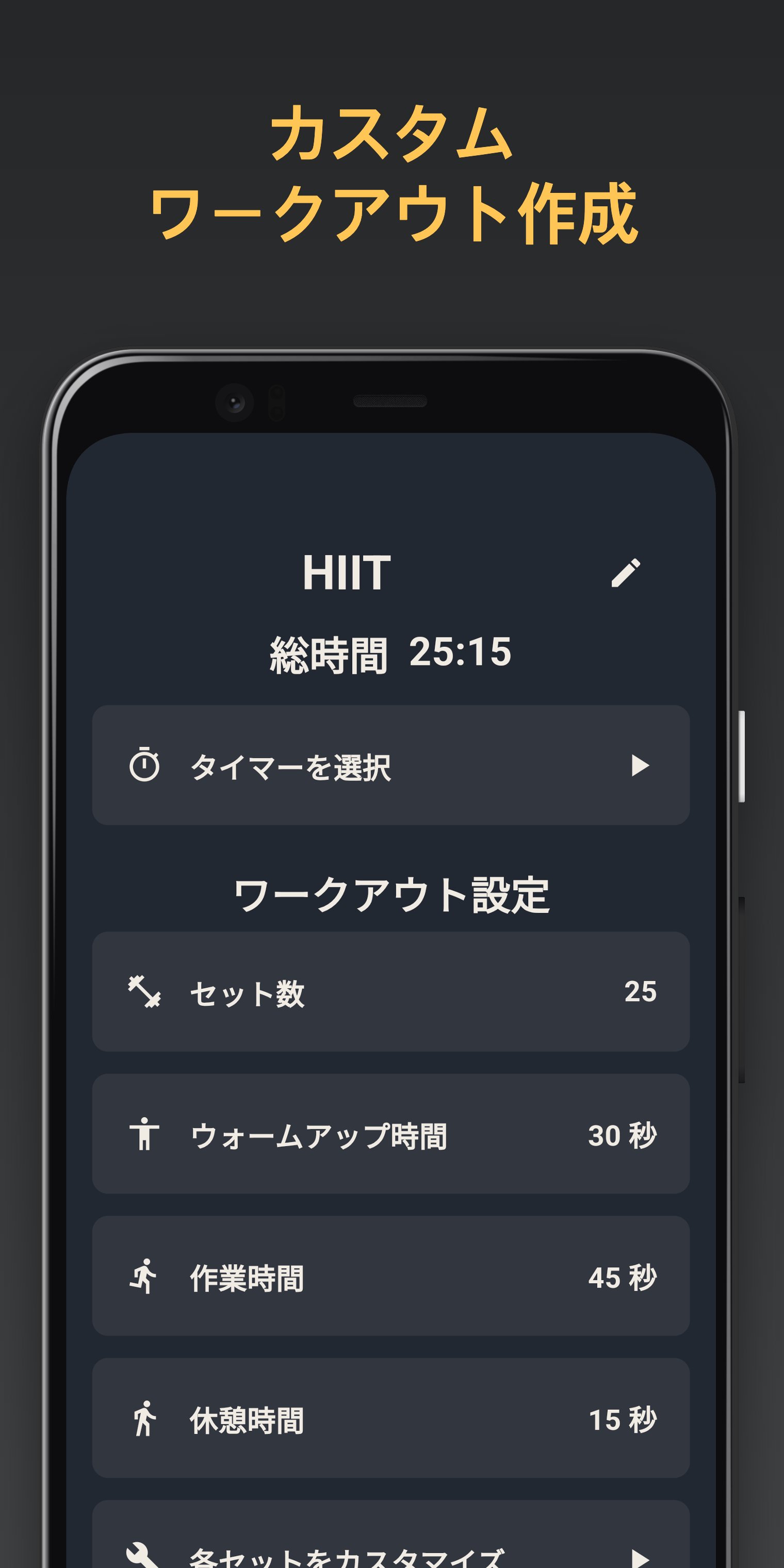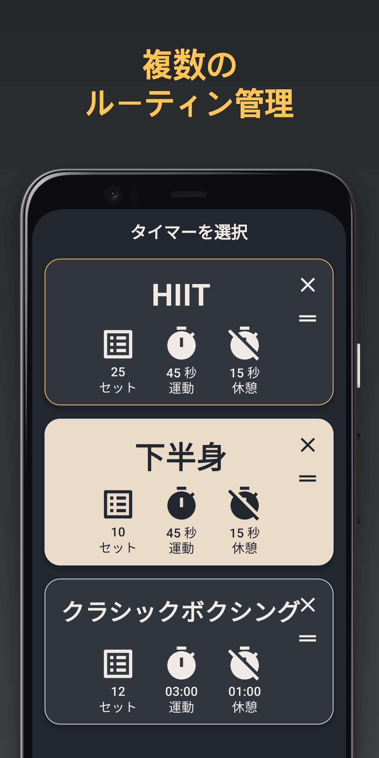 カスタムルーティン設定: セット数、ワークアウト時間、休憩時間を自由に調整して、個々のルーティンに合わせられます。