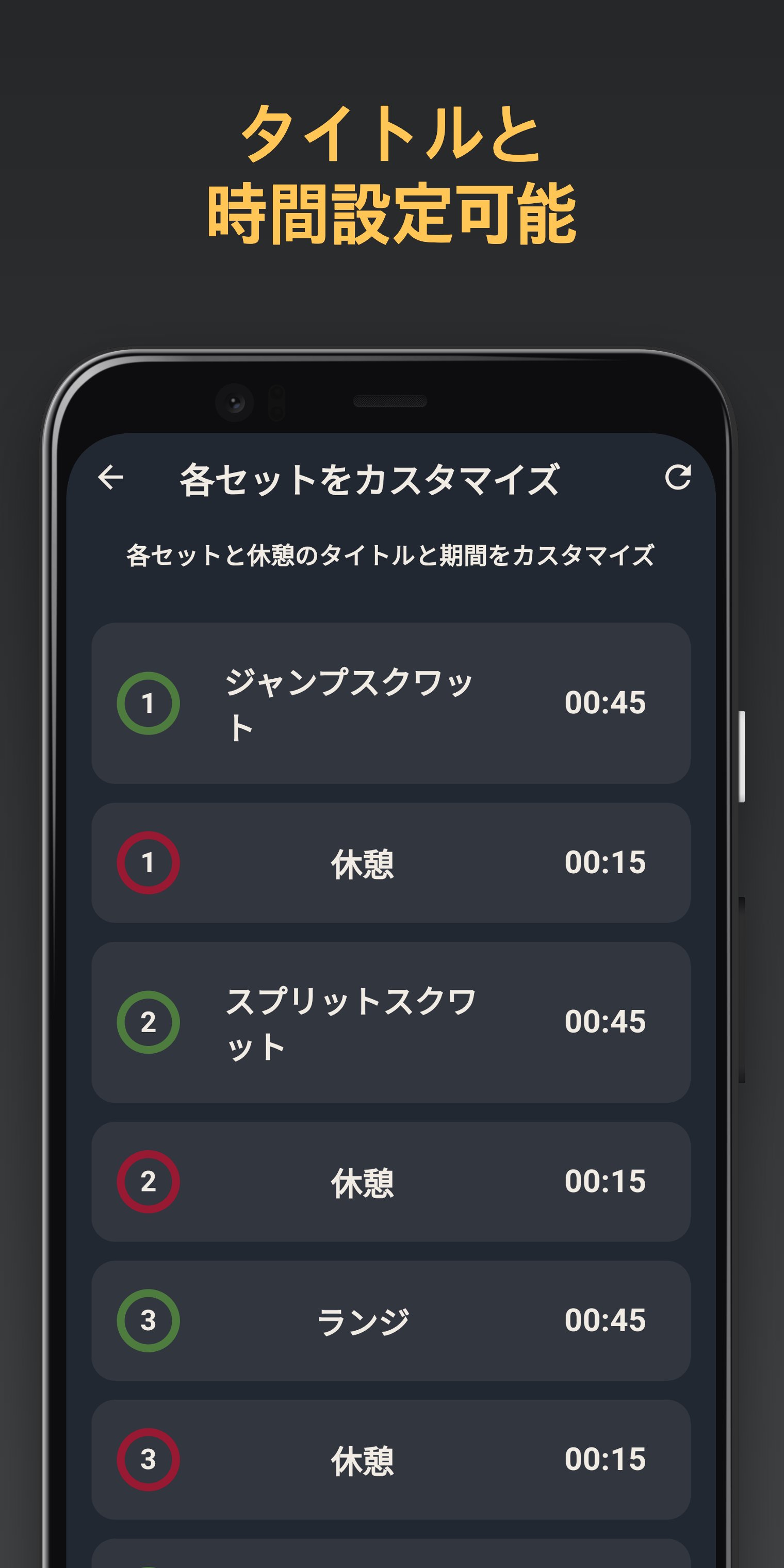 セット時間とタイトルの詳細な調整: 各セットの時間とタイトルを詳細に調整し、カスタマイズされたワークアウトプランを作成できます。