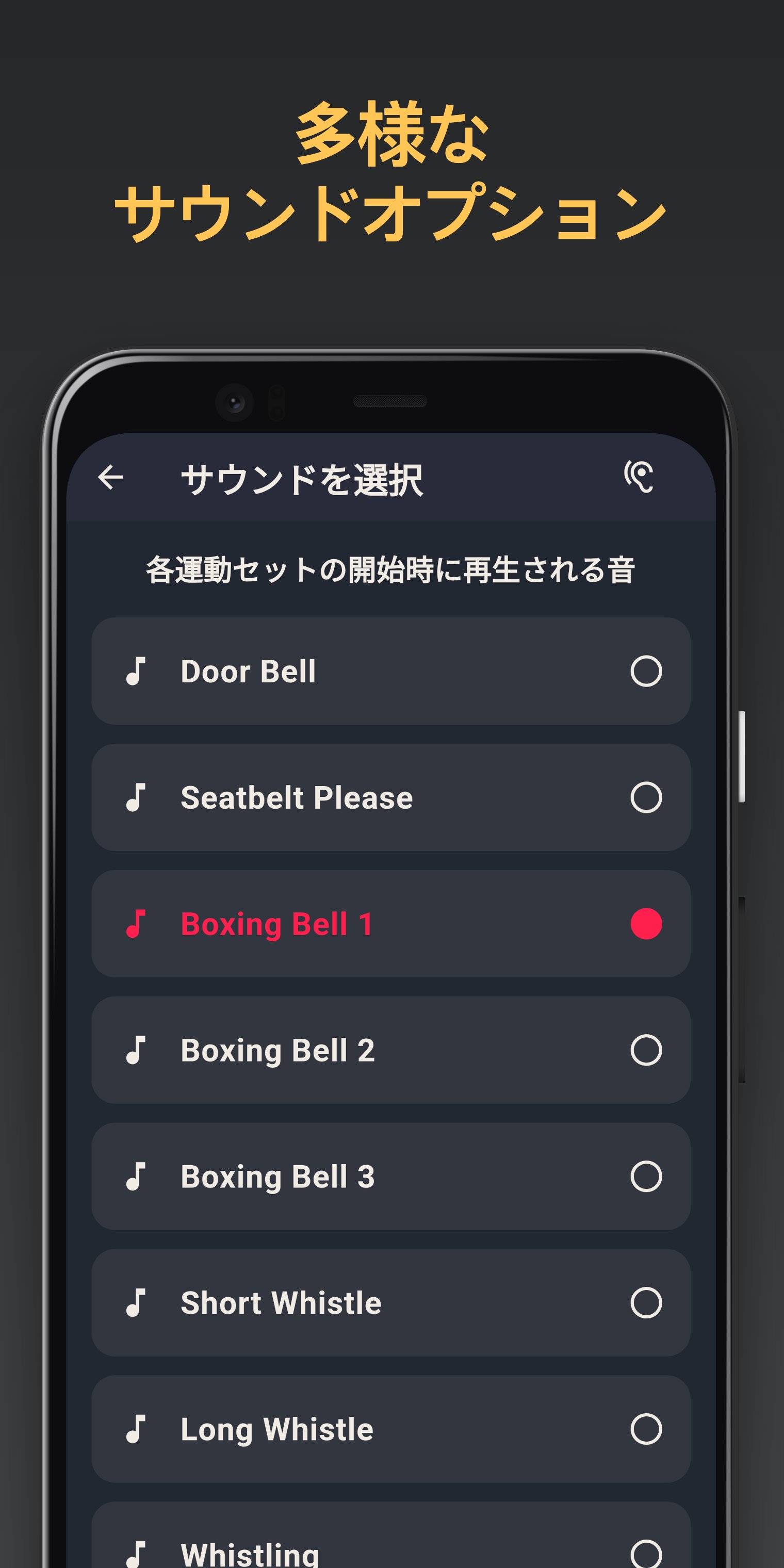 多彩なアラーム音のオプション: ワークアウト、ヨガ、瞑想などの活動に適したさまざまなアラーム音を選択できます。