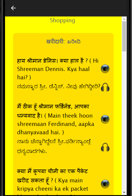 This language learning application can also be used by those Kannada speaking participants who are preparing for BPO, Call Center, Hindi Discussions and Debates as well as Hindi job interview. If you want to learn Hindi grammar, it is advised that you initially go through this application get yourself ready for your next assignment. If I want to learn Hindi, I should be approaching this application for the same and go through all the chapters. This app can help you learn Hindi fast using audio. It is easier to learn the language using Hindi conversation rather than through an Hindi Dictionary. Learning Spoken Hindi had never been easier. Exercises, vocabulary and business Hindi make this application a very special one.