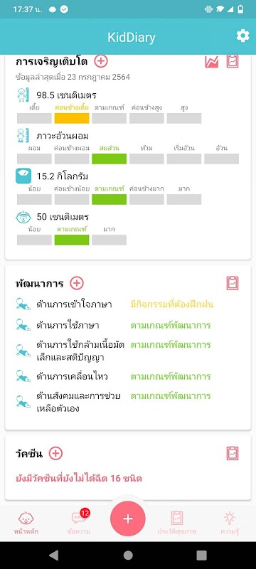 このKidDiaryアプリケーションは親向けです。これは、全国的な子供と若者の健康データベースであるKidDiaryプラットフォームの一部です。家庭(KidDiary)、学校(KidDiary School)、病院(KidDiary Hospital)からの情報を結び付け、タイの子供たちが成長し、年齢に応じて成長できるように、すべてのセクターが一緒に成長できるようにします。
