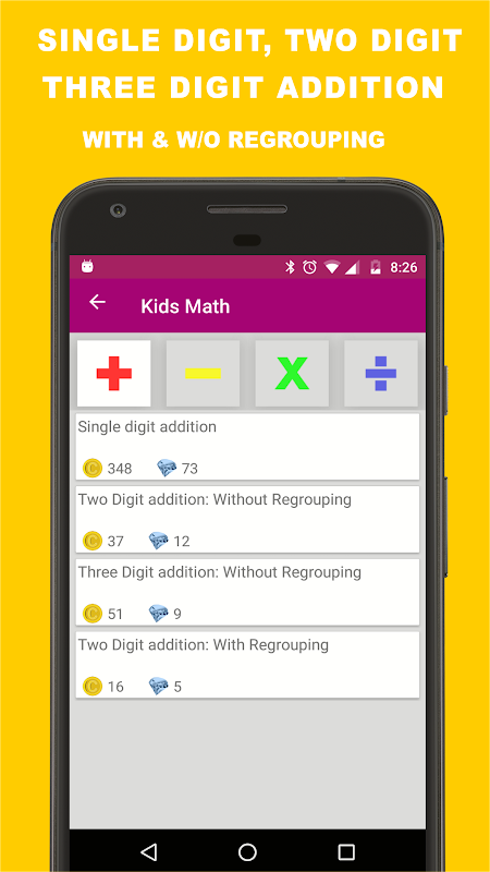 Kids Math, provides free and fun filled Cool Mental Math games for Elementary kids for practicing Addition, Subtraction, Multiplication, and Division. It helps you to increase your Math calculation speed and accuracy. This game is most suitable for kids from age 7 to 12 years. Also, adults who love math will enjoy this game. It may be challenging for grown ups too.
