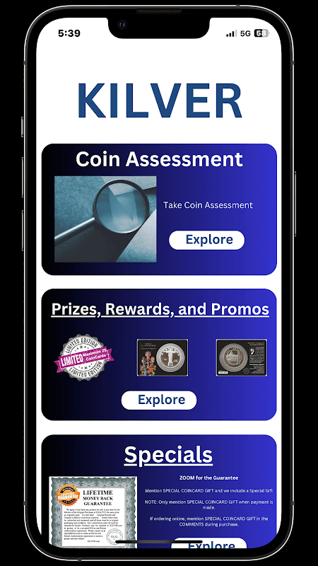 Kilverアプリでは、コインの評価、コインコレクション、スペシャルコレクション、レア限定版のコイン情報にアクセスできます。