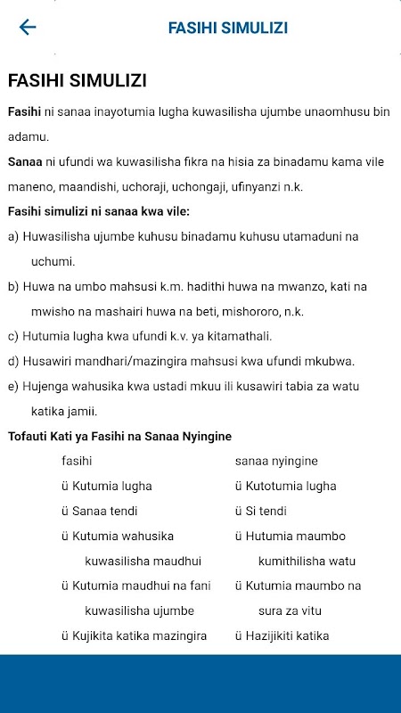 このアプリは、学生、教師、および勉強を希望するすべての人を対象としています。短縮され、理解しやすくなった完全なスワヒリ語のトピックが含まれています。