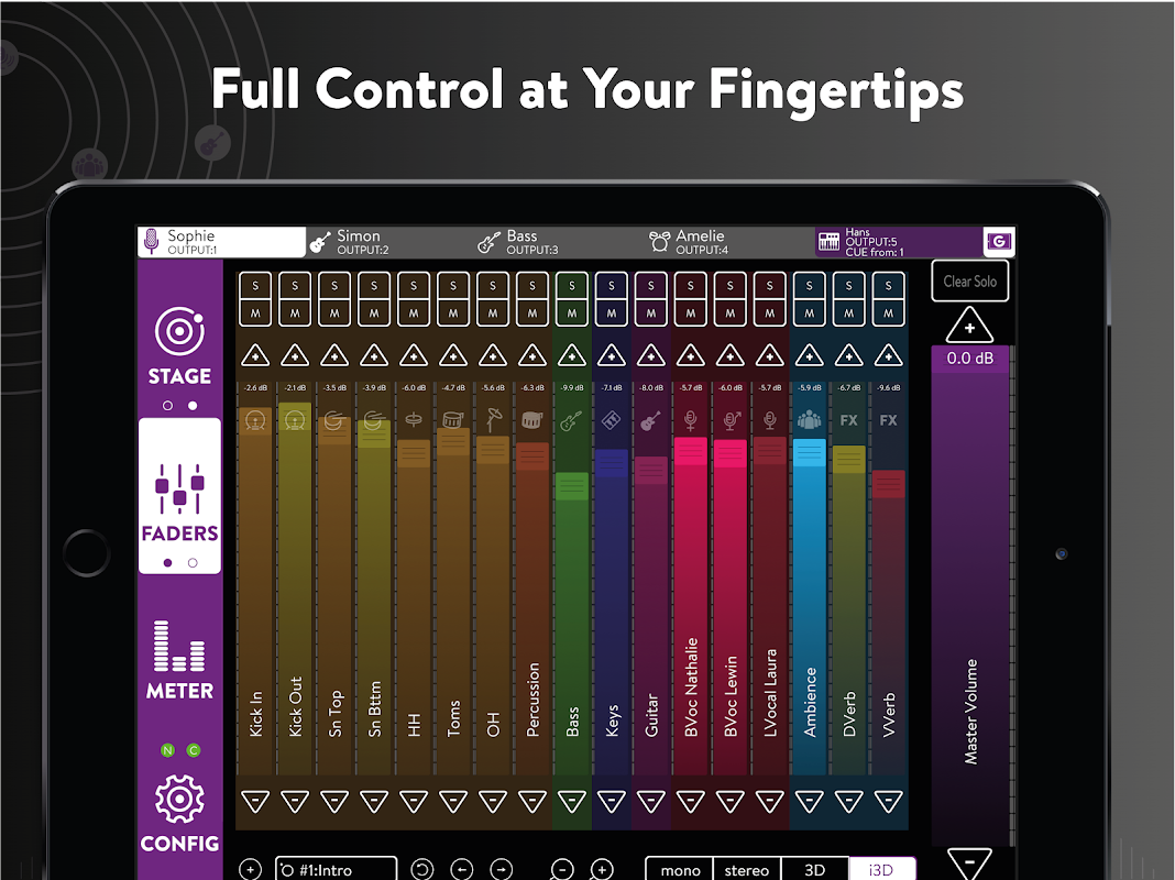 ドラッグ アンド ドロップを使用して、各楽器を頭の周りだけでなく上下にも空間的に配置します。従来のステレオと 3D のいずれかを選択します。世界最高峰のサウンド エンジニアが私たちと協力し、日々のニーズに合わせてすべてを調整しました。ミュージシャンとサウンド エンジニアは、個々のミックスをリアルタイムで同時に作業できるようになりました。