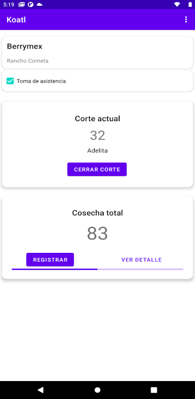 Koatlを使用すると、出席とベリーの収穫を記録し、各従業員を追跡できます。デバイスに接続がある場合、情報はリアルタイムでKoatl Webに送信され、そこでさまざまなレポートで表示されます。デバイスが常に接続されていない場合、情報はデバイスメモリに保存され、次に接続が利用可能になったときに同期されます。この情報を収集することにより、KoatlWebは従業員の給与を自動的に生成します。