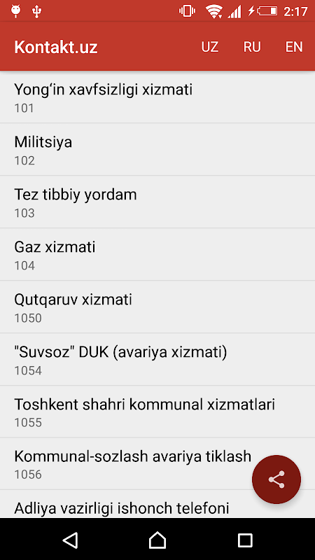 Kontakt.Uz - это приложение которое позволит Вам дозвониться до экстренной службы, с помощью одного нажатия на нужную Вам кнопку и предоставит правильный номер для вызова милиции, скорой помощи, пожарных и других жизненно важных служб.