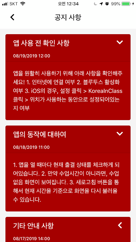 学生はアプリを開いてリフレッシュするたびに、現在の授業があるのか、授業がある場合、自分が入室したか退室したかどうかなどを視覚的に知ることができます。