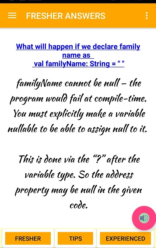 Kotlin interview programming question and answers *User Interface is improved *Audio for answer is available *We will be adding more questions incoming weeks