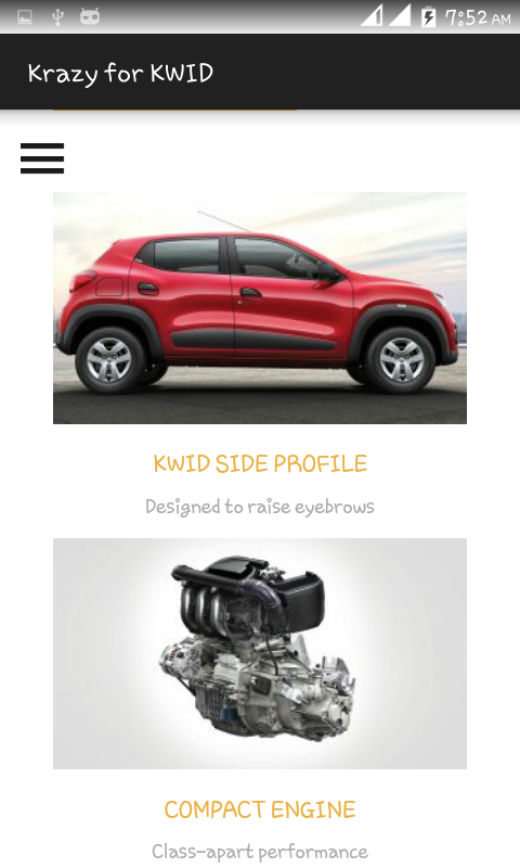 krazyForkwid application has all basic information of Renault Kwid. This is unofficial application. its only aim to show craziness and love to Renault Kwid