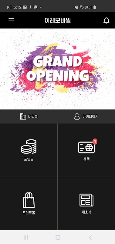 1) 메인 화면: 우리 대리점에서 진행하는 이벤트와 고객님께서 보유중인 헤택, 그리고 알람 메시지를 한 눈에 확인할 수 있습니다.