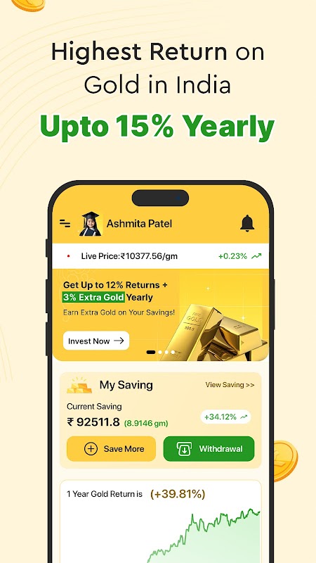 24Kデジタルゴールドに安全に投資。年間15%の利回り。インド全土で信頼されています。