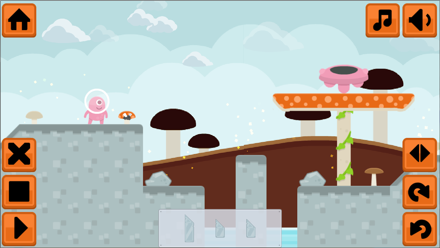 ブロックをドラッグして橋を架けたり、スロープを作ったりして、宇宙人たちが安全に目的地までたどり着けるようにしましょう。