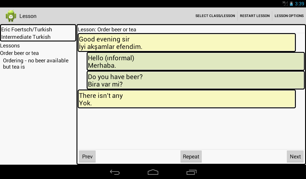 4. With the English text display is turned off, tap on the Turkish text phrase to have the English equivalent displayed.