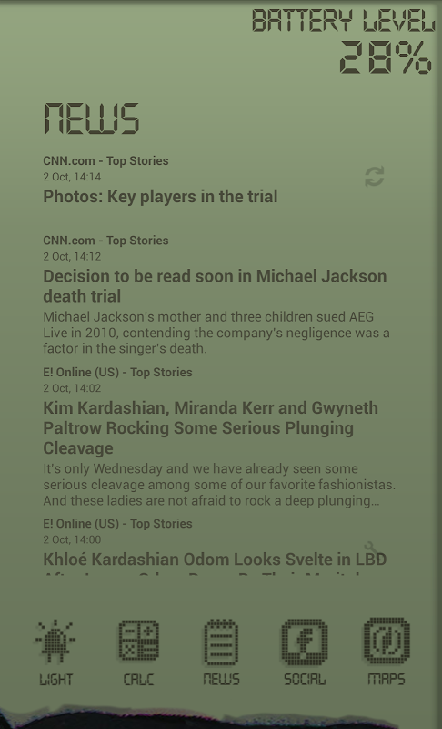 このホームスクリーンをテーマにしたレトロなLCDディスプレイの外観を得る。この2ページの設定は、日付と現在の気象条件に大きく、大胆なクロックを提供しています。簡単にアクセスでき、あなたの音楽、カメラ、フォトギャラリー、SMS、電子メール、電話などへのショートカットです。 2番目のページで、あなたのお気に入りのニュースソースを表示することができ、カスタマイズ可能なライブニュースリーダーです。