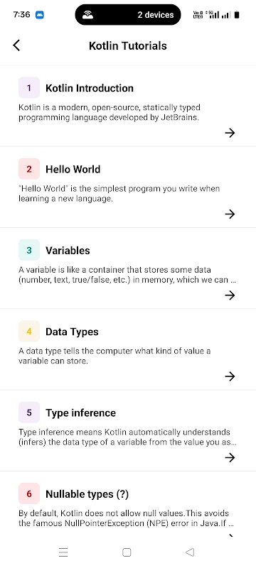この Android 学習チュートリアルアプリは、Android プログラミング、Android 開発、Kotlin チュートリアル、そして Kotlin プログラム例を段階的に学習できるように設計されています。Android 初心者から Android アプリケーションの開発を目指す開発者まで、あらゆる方に最適なガイドです。このアプリは使いやすく、基礎から高度な概念まで網羅しており、分かりやすい内容です。Kotlin の知識は必須ではありませんが、推奨されます。
