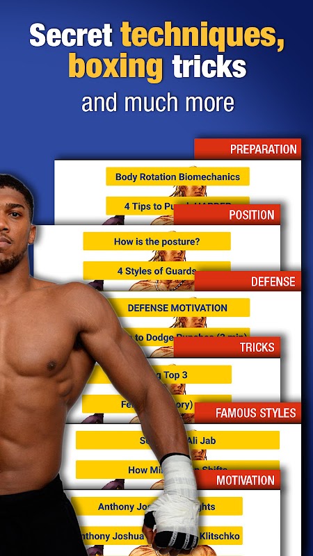 さまざまなタイプのボクシングスタンス、フェイント、特別なパンチ、より良い打撃のための手と体の準備、そして伝説的なボクサースタイルが含まれています。